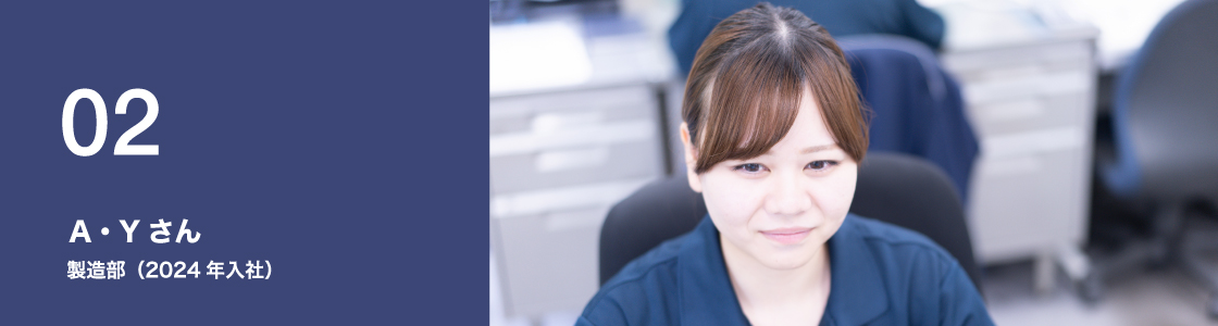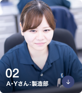 私はモノづくりに興味があるとともに、製造現場を裏側で支える事務の仕事に魅力を感じ入社しました。仕事内容は、日報作成・データ入力・在庫管理、発注・担当している製品の生産計画の管理と調整等です。現場が円滑に業務を進められるようにサポートに努めています。毎日生産状況や受注状況を確認し生産計画の改善を行う以外にも、日々新しい課題に取り組むことができ達成感や成長を実感できるため日々やりがいを感じています。